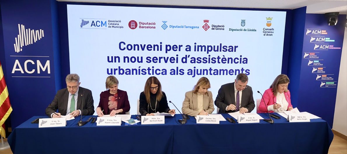 La Diputación de Barcelona ha firmado este martes 13 de enero un convenio de colaboración interadministrativo para poner en marcha un nuevo servicio de asistencia urbanística dirigido a todos los ayuntamientos, con atención especial a los municipios con menos recursos propios. El convenio, impulsado por la Asociación Catalana de Municipios (ACM) y la Fundación de Impulso del Territorio (FMIT), lo han subscrito también las diputaciones de Girona, Tarragona y Lleida, además del Conselh Generáis de Aran, en un acto celebrado en la sede del ACM en Barcelona.