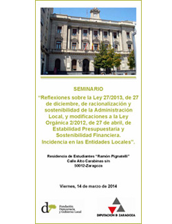| Seminario: "Reflexiones sobre la Ley 27/2013, de 27 de diciembre, de racionalización y sostenibilidad de la Administración Local, y modificaciones a la Ley Orgánica 2/2012, de 27 de abril, de Estabilidad Presupuestaria y Sostenibilidad Financiera. Incidencia en las Entidades Locales" | ||||||