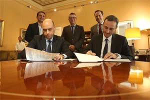 | César Sánchez firma con el alcalde de la ciudad, Gabriel Echávarri, el convenio de colaboración para la ejecución de este proyecto | ||||||