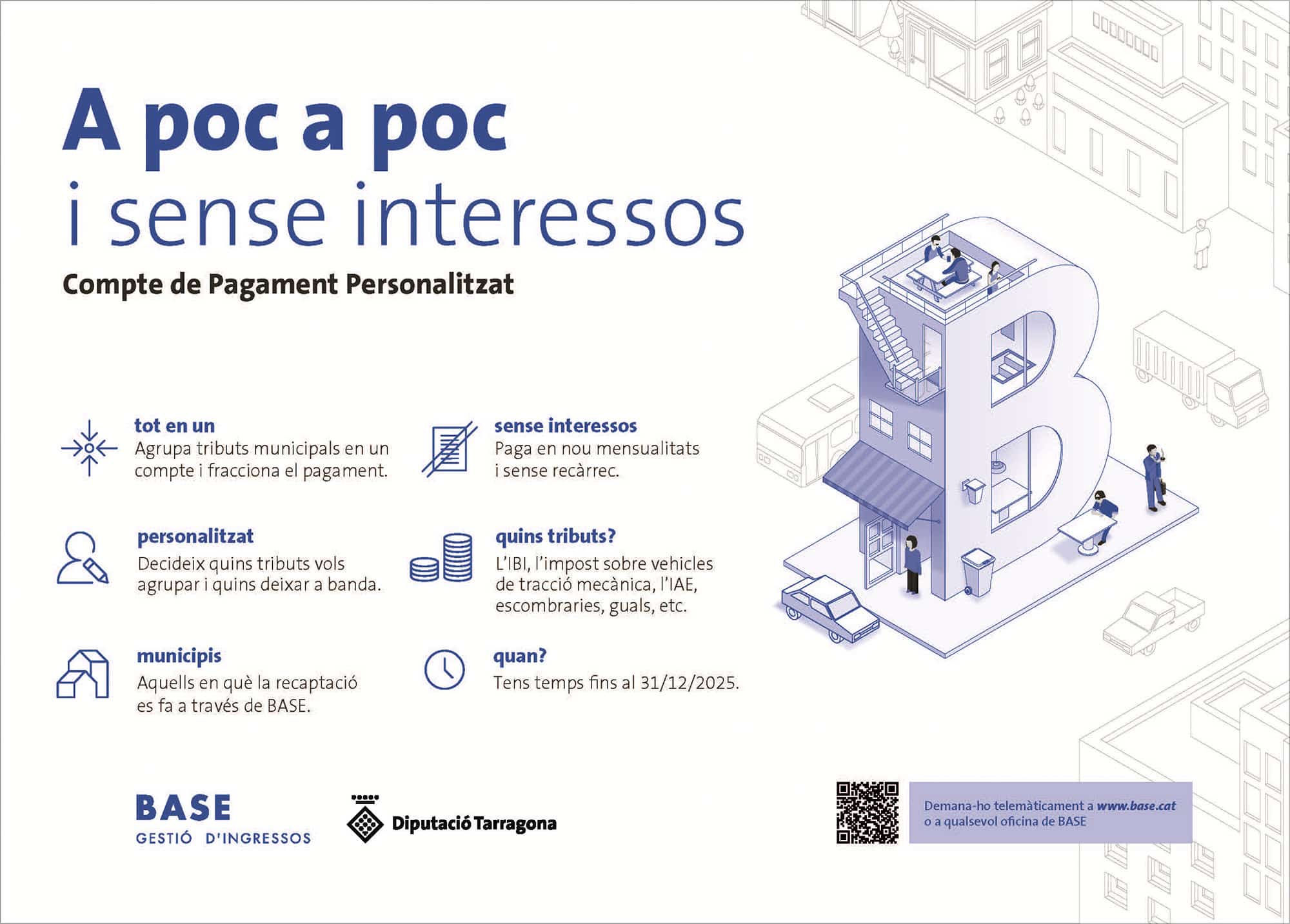 Agrupar los tributos municipales y pagarlos a plazos y sin intereses es el que permite la Cuenta de Pago Personalizado de BASE. Una herramienta que facilita el fraccionamiento y el pago de los impuestos en aquellos municipios en que la recaudación está delegada al organismo autónomo de la Diputación de Tarragona, BASE-Gestión de Ingresos. Las personas interesadas en solicitar este servicio de cara al 2026, pueden hacerlo hasta el 31 de diciembre en www.base.cat o presencialmente en la red de oficinas de BASE en toda la demarcación.
