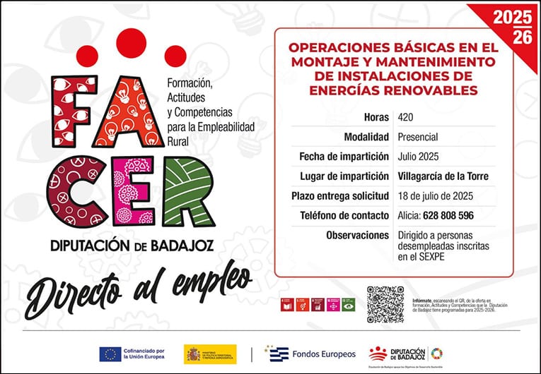 La Diputación de Badajoz, a través del Proyecto FACER (Formación, Actitudes y Competencias para la Empleabilidad Rural), pone en marcha el proceso de recepción de solicitudes para una nueva acción formativa dirigida a mejorar las oportunidades de empleo en el ámbito de las energías renovables.