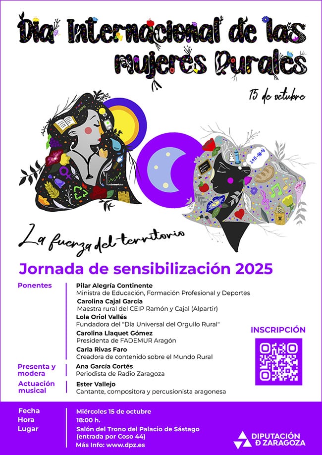 La Diputación de Zaragoza conmemorará este próximo miércoles el Día Internacional de las Mujeres Rurales, que cada año se celebra el 15 de octubre, con una jornada de sensibilización en el palacio de Sástago. El evento tendrá lugar en el salón del trono a partir de las 18.00 y la entrada será libre previa inscripción rellenando un formulario online.