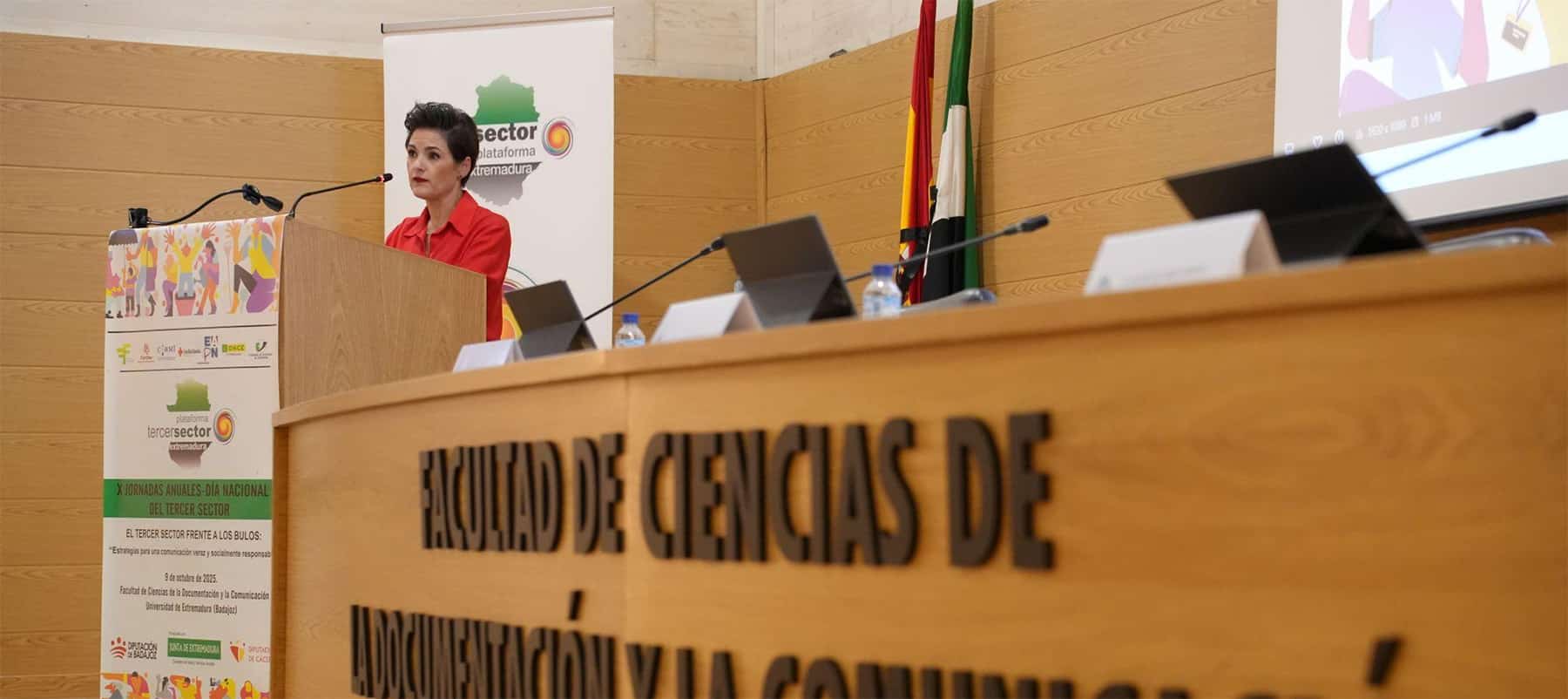 La presidenta de la Diputación de Badajoz, Raquel del Puerto, ha participado hoy en la inauguración de las X Jornadas Anuales de la Plataforma del Tercer Sector de Extremadura, celebradas en la Facultad de Ciencias de la Documentación y la Comunicación de la Universidad de Extremadura bajo el lema ‘El tercer sector frente a los bulos: Estrategias para una comunicación veraz y socialmente responsable’. Durante el acto de apertura institucional, la presidenta de la Diputación ha puesto en valor el papel esencial que desempeñan las entidades del Tercer Sector en la sociedad actual.